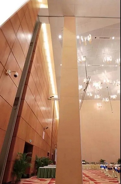 那么這種隔斷和我們通常看到的酒店內裝的導軌式隔斷有什么區(qū)別呢?通常我們看到的那種隔斷為100型活動隔斷,隔斷厚度為100mm,這種隔斷的最高可達12m。